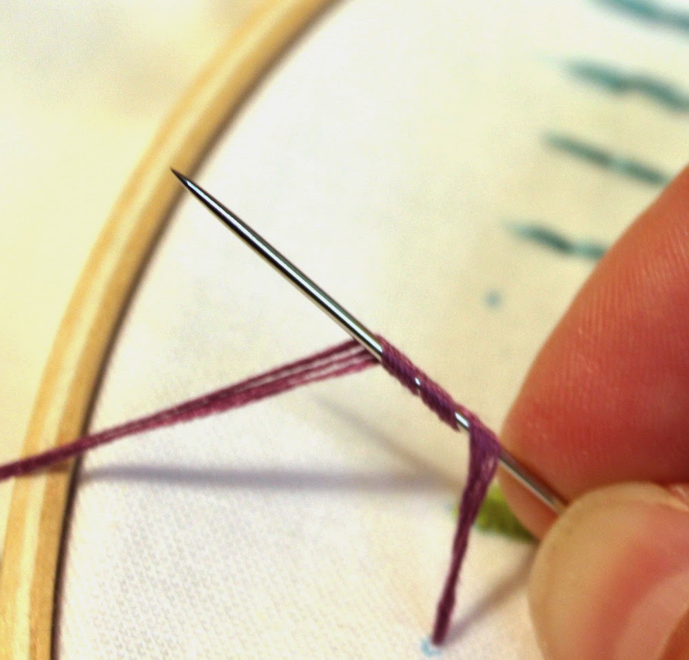 Here is the most important part, the hand holding the floss should continue to hold the floss, pull the floss pretty snug. The floss will slide down the needle, continue to keep the floss snug. Start pushing the needle into the fabric. At this point it should look like a knot on your needle, see the photo?