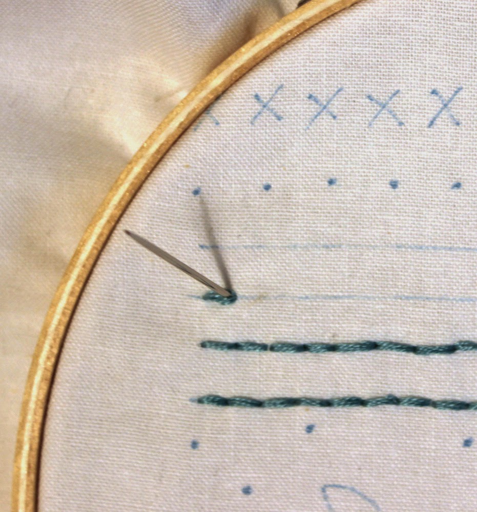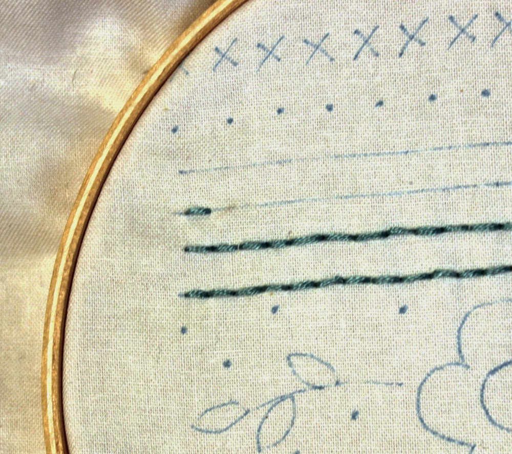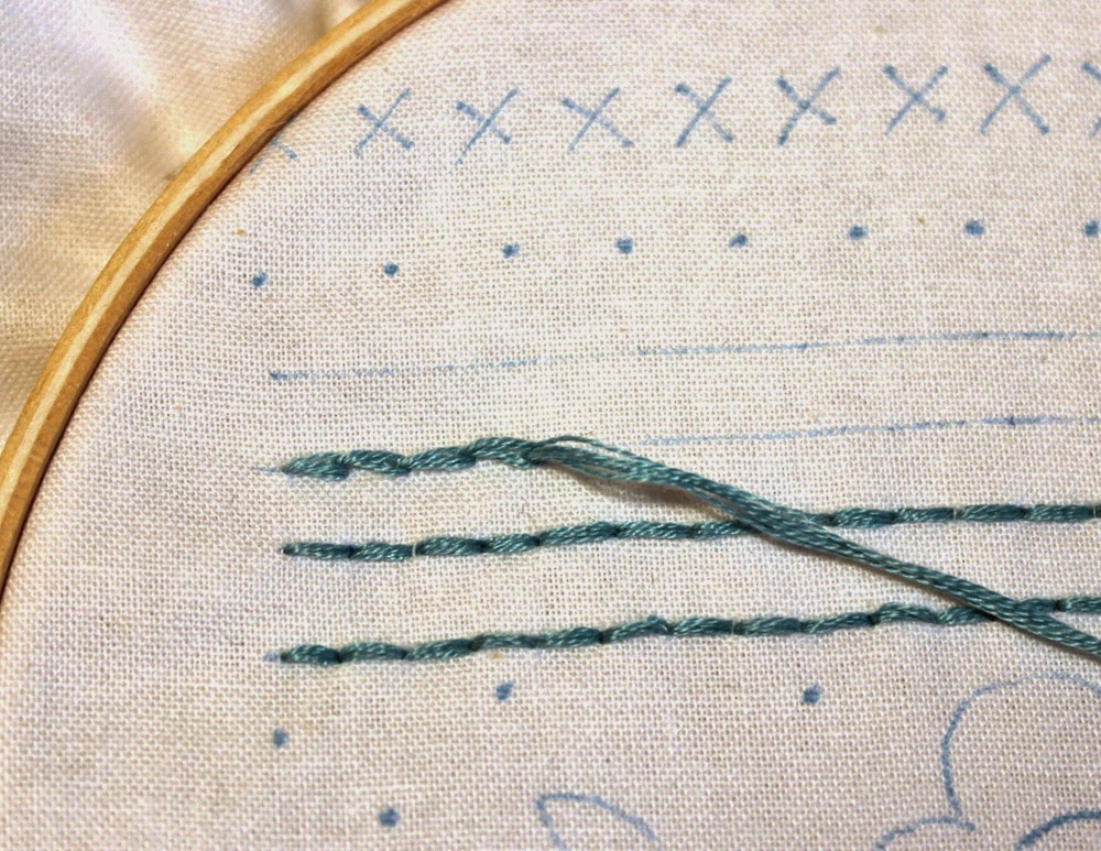 How's the sampler coming along? Were starting on our third stitch today, this one is called the split stitch. It's called the because you split the previous stitch as you go. I like to use this stitch on vines it's a very organic looking stitch to me.