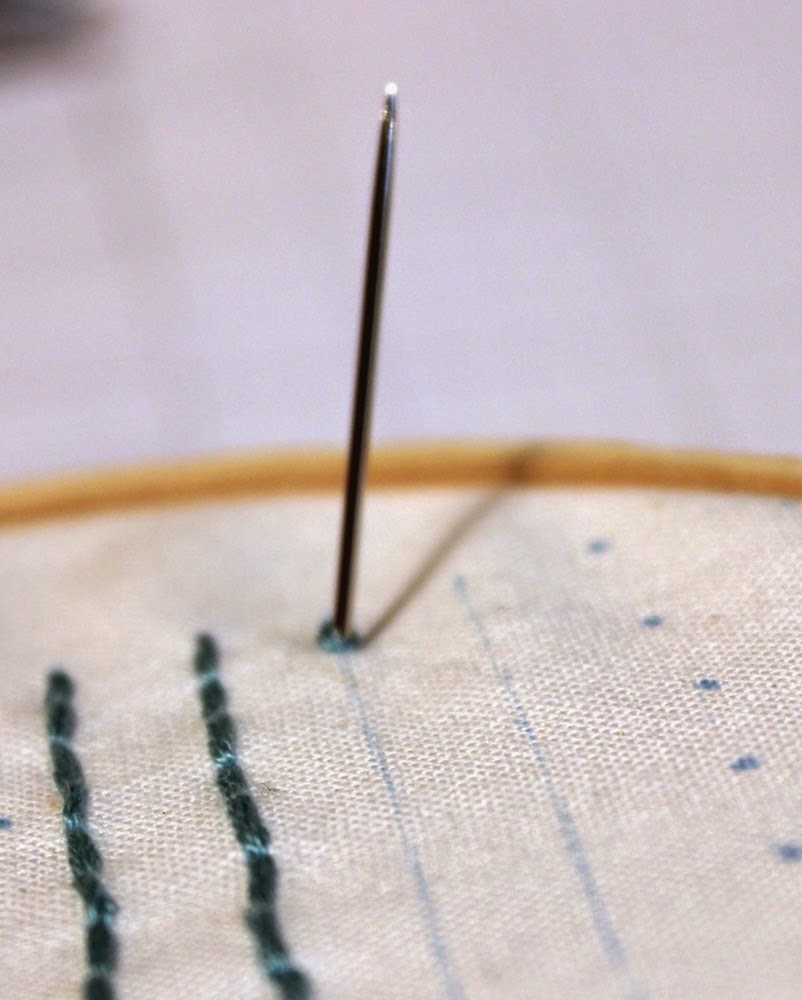 You'll notice the needle comes up through the floss towards the end of the prior stitch.