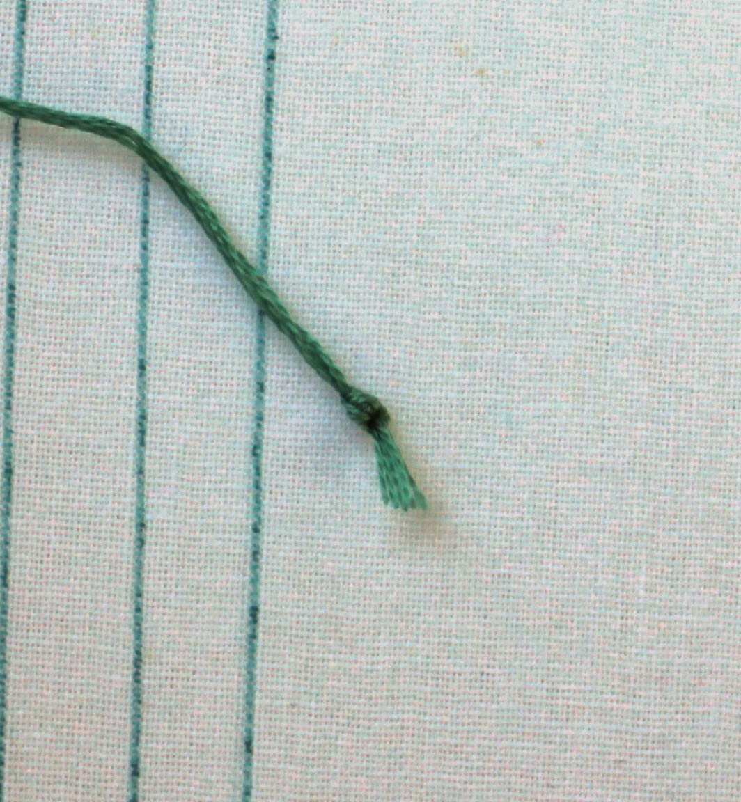 First, cut off approximately 24" of floss for this stitching. Thread the needle with the floss. Tie a knot at one of the ends of the floss. Pull the floss so the un-knotted side has approximately 10" of floss.