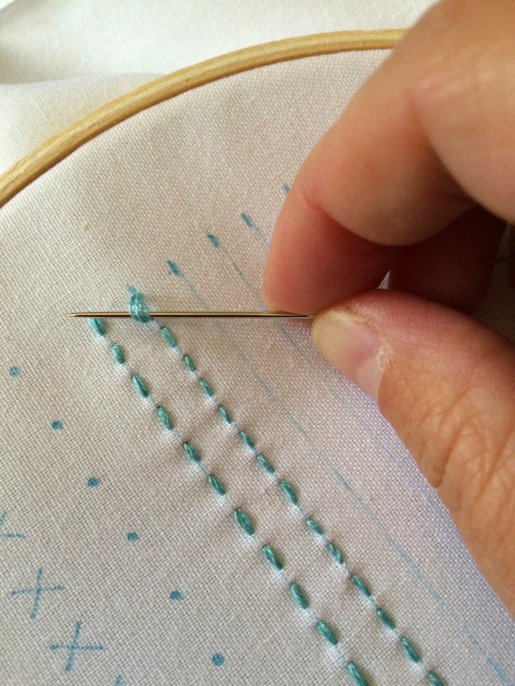 From the back pierce the fabric with the point of your needle at the beginning of the bottom line. From the top, pull the needle through the fabric until the knot reaches the back of the fabric.