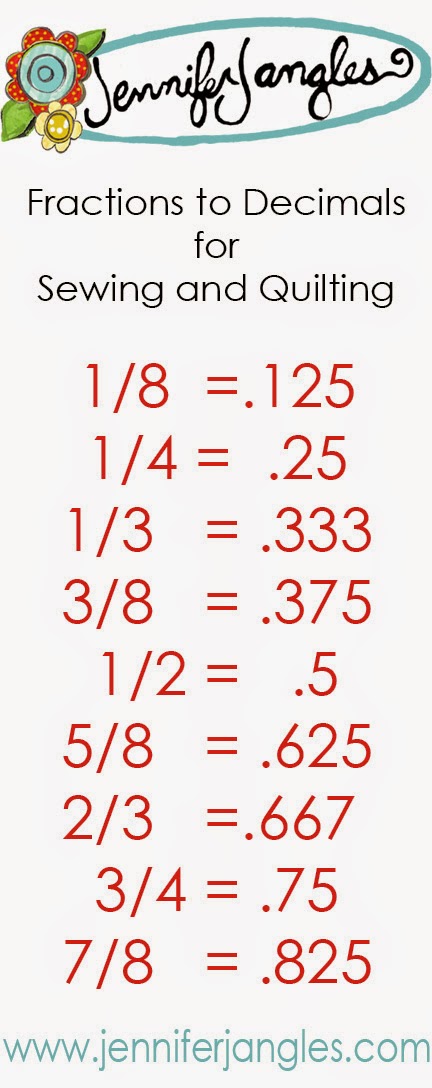 Here's a handy dandy reference guide for when you are calculating your sewing projects and yardage. You can pin this on Pinterest and then when you need to remember what the decimal equivalent is to the fraction of an 1/8 yard it's all right here!