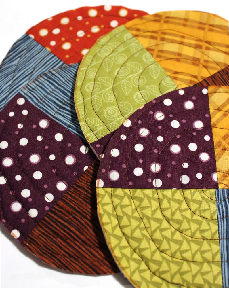 Here's a great gift for just about anyone. Make them to match their decor or in a fun print of something they like. These coasters are six inches wide, that way they can hold the biggest of mugs and still show off a little fabric while being used.