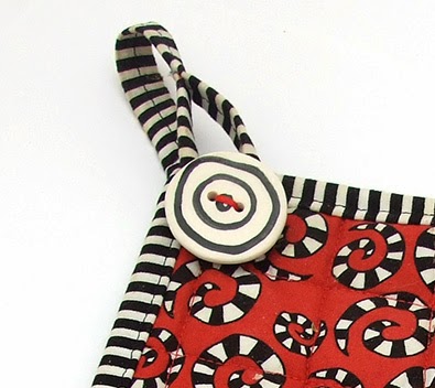 Only three more Holiday Projects left, time is flying by us. I have these potholders in my kitchen and I find them very handy. I know there are lots of potholder tutorials out there, nut here's what is different about mine. You see that button? The binding continues off of the potholder and makes a loop. It can be hung on your stove and it's right there when you need it, handy eh?