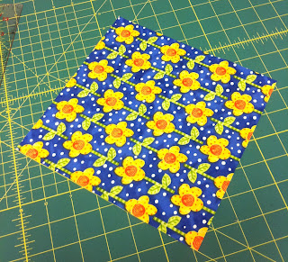 4. Place a square of fabric right side down on your work surface. Place two pieces of batting on top, then the heat resistant fabric, and then the last full square should go on top with the right side facing upward. Add the pocket piece to the top of this stack. If you need to trim the edges to square thing up, do this now.