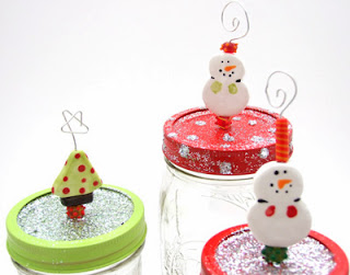 Holiday Treat Jars would be good for putting baked goodies or candy in for gifts. They are really easy to make. I spray painted the lids of canning jars. Once they were dry I hammered a nail through the center of the lid and then pulled the nail out. This left a hole just the size for my 18 gauge craft wire. I made a little spiral at one end, threaded it through the hole and put a dab of hot glue on the wire to hold it in place. While I had the hot glue gun on, I went ahead and put a little glue around the rim on the inside. This will hold the two lid pieces together. Next I added some glitter, strung on the beads and finished off the top with a little spiral or star.