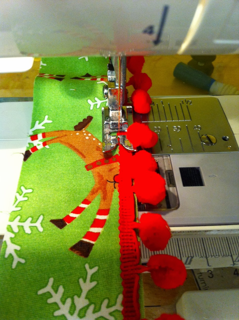 3. With your machine or needle and thread, sew the pom pom trim down fabric.