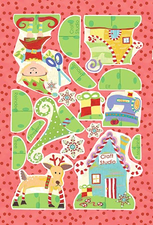 For no other reason than I am a little bit crazy, I made these little holiday paper dolls. It all started when I was coming up with my Holiday Projects header. These paintings are taken from my It's Christmas! line of fabric, I started changing them a bit to make the theme a little more crafty. I added a sewing machine and some beads. In my head I started calling him crafty elf, once again don't ask, I work alone and I have to entertain myself somehow.