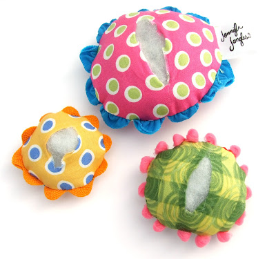 3. Cut a slit down the bottom side of each circle. Clip the curved edges and turn right sides out. Fill with fiberfill.