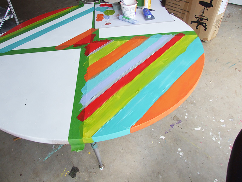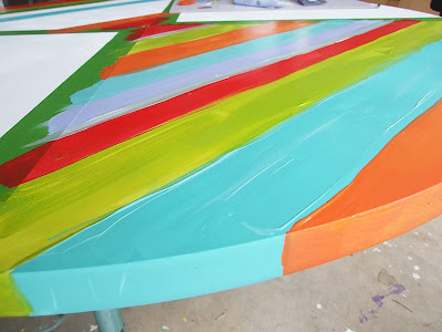 I bought this table a few years ago at the Habitat for Humanity Store here in Athens. I am a sucker for furniture like this. It was an old preschool table with cool turquoise metal legs. It was in my studio for several years. Things have gotten "snug" in the studio so it needed to move. Nik didn't really like the table so I couldn't convince him to move it upstairs....until... I said I would paint it. Then he was interested. It's probably hard to believe he likes color more than me most of the time.