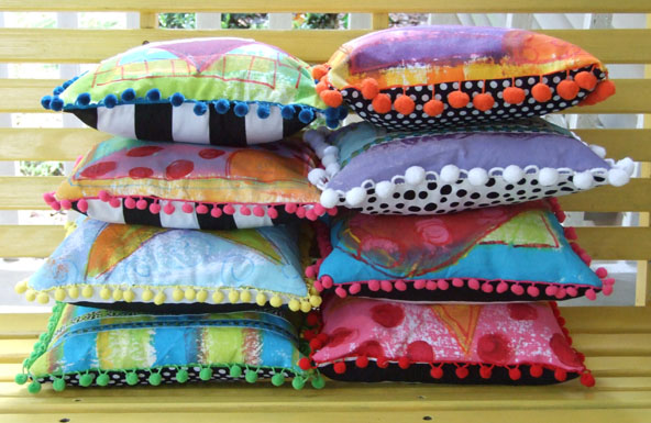 But this month it's painted pillows! I painted up a bunch of different designs on canvas and then stitched them up with some black and white and ball fringe.