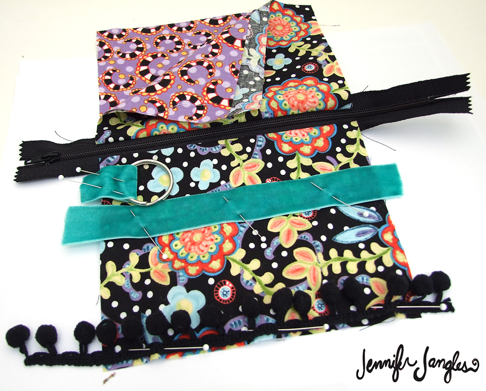 Now that your zipper is in place you can breathe a sigh of relief. You did it! Now it's on to the fun part, embellishing. Place 7" of ribbon about one third of the way down the bag and in in place. With the remaining ribbon slide the key ring on and fold in half. Pin this to the top side of the bag front. Make sure of two things; 1. the ring is facing in and is not within a 1/4" of the side 2. The ring is on the same side of the bag as the zipper pull. Last pin the ball trim across the bottom facing inward as well. Whew!