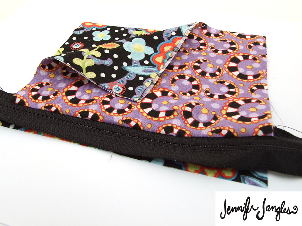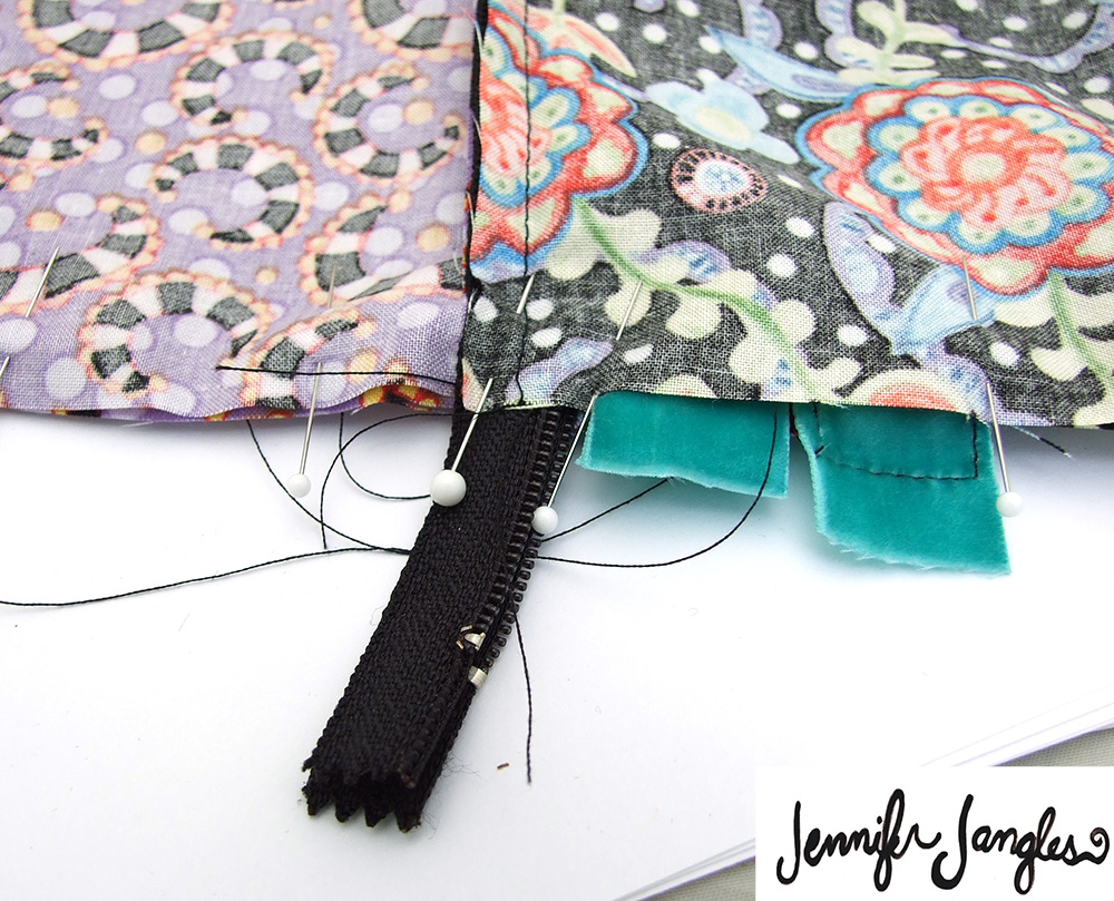 Pin the zipper onto the outer fabric and then the remaining lining fabric to the zipper. The lining should be facing down as shown in the photo. Sew along this seam just as you did the first side of the zipper.