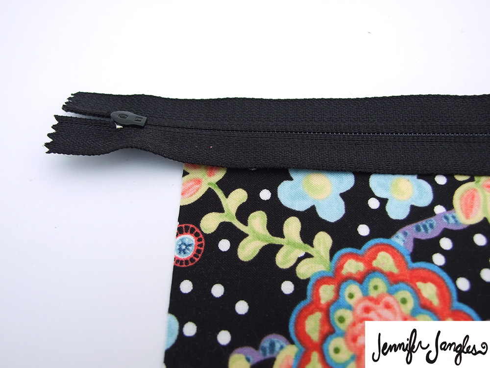 Flip the zipper over so that the zipper head is facing down, as shown in the photo.Line the edge of the zipper up with the edge of the fabric. Pin in place.