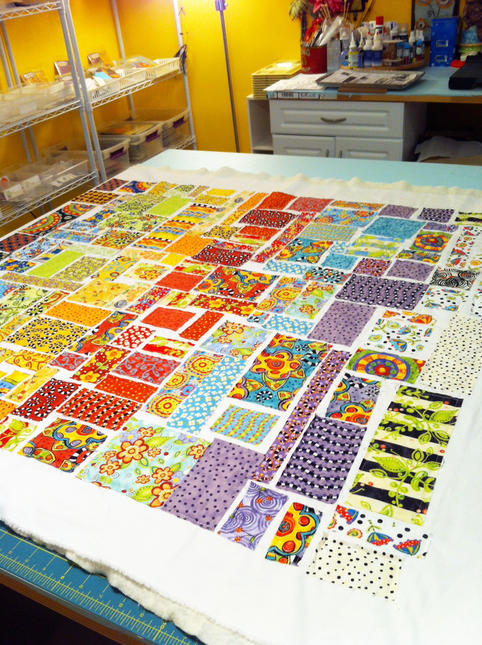 First I started by deciding how large I would like the quilt to be. With ticker tape quilts you quilt as you go. Since this was my first time doing this I decided to stay small. My quilt would be a wall hanging measuring 36" x 45"-ish. I cut my white background, batting, and backing a bit larger. Sandwiched them all together and got it all on my work table. I started sorting my fabrics and cutting squares and rectangles of all sizes. At that time I didn't have a clue about how I was going to lay them out. I like to figure things out as I go, so I hopped right in to cutting and arranging.