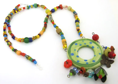 I made another necklace, this time I went with an eclectic look. Those are African trade beads with a bunch of different assorted dangle hanging from all of those loops. It was a lot of fun to put together.