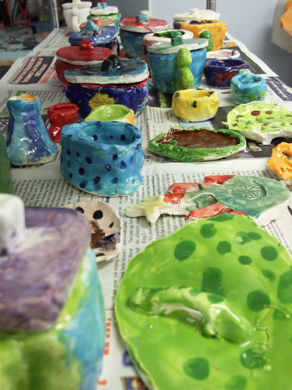 So what's up? Happy Friday...wahoo. I have been working every Saturday at the gallery for the past month but this Saturday Katie will be working. I am really happy to have the day off. Even though, I will still be dropping my boys off because they have clay class there. Here's a picture of some of their pots.....