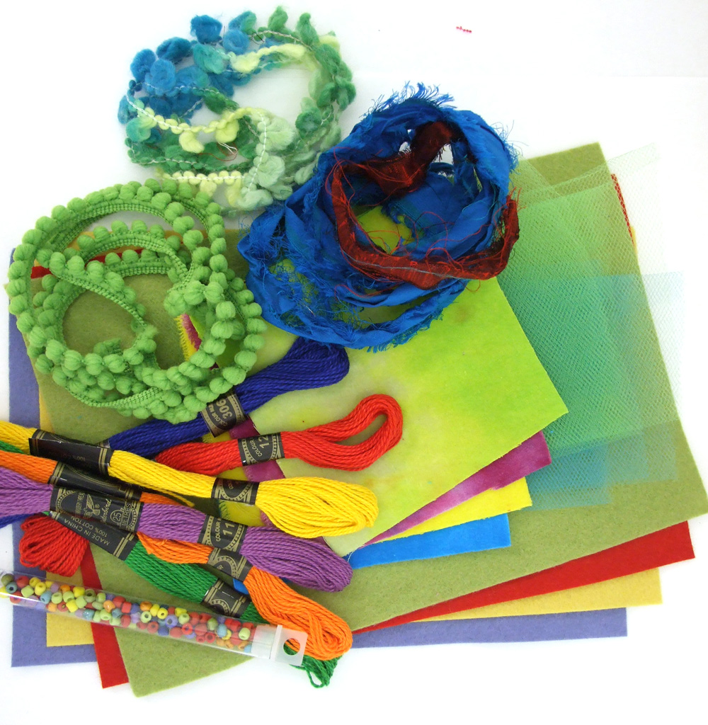 Where did I get all of those snazzy felts, beads, flosses, and velvets? From my embellishment kits. I found myself using the same supplies over and over again and decided I should kit them up. I don't know about you but I am a sucker for kits of fun stuff like this. In each pack you get an assortment of felt, tulle netting, floss, beads, trims, and my favorite, hand dyed velvets. Yep... I dyed those and I really wanted to keep them all for myself. Oh...I should mention each kit is a little different in color, even though they are all bright, how fun is that?