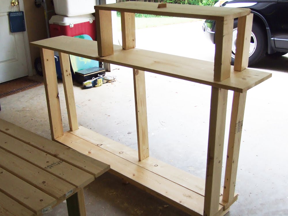 I knocked this bench out in less than an hour and I still had wood left. I needed a shelf for my new fabric. I put this shelf together. I had to spend 12.00 on the long piece of wood on top. I had a couple feet left so I built a mini shelf with it.