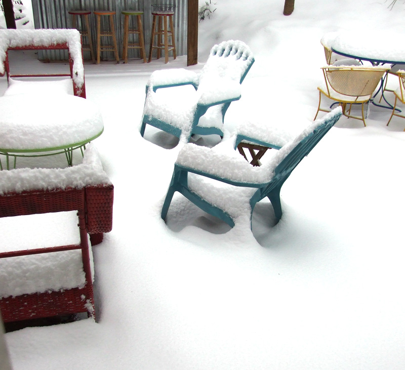 8 inches of snow fell last night at our house. We have been warned about this since Friday and we and everyone else around here prepared for the storm. Still, we weren't expecting so much. It's always a mad dash to the grocery store before a storm. The stores stock extra bread and milk because everyone panics. I have to admit I have become one of those people. There is no way you will get me out on the roads with Georgia drivers in snow. So the first Krogers I went to yesterday I drove around the parking lot four times and could not get a spot. There were tons of people looking for spots, double parking, etc. I gave up and drove across town to a Krogers that has a giant parking lot. Inside was the craziest experience. Every Kroger employee was there stocking the shelves. Imagine the busiest Christmas eve shopping day and double it. That's how busy the store was with customers. The shelves were cleared of bottled water. You would have thought it was the end of the world. Peoples carts were piled high with essentials like water, milk, bread, and fire wood. It was very calm and they were playing soothing music. It was amazing to me because right before I left Nik and I were talking about how the pictures on the weather channel were showing empty grocery store shelves. We were wondering how they staged those photos because there was no way they were really empty. Boy were we wrong!