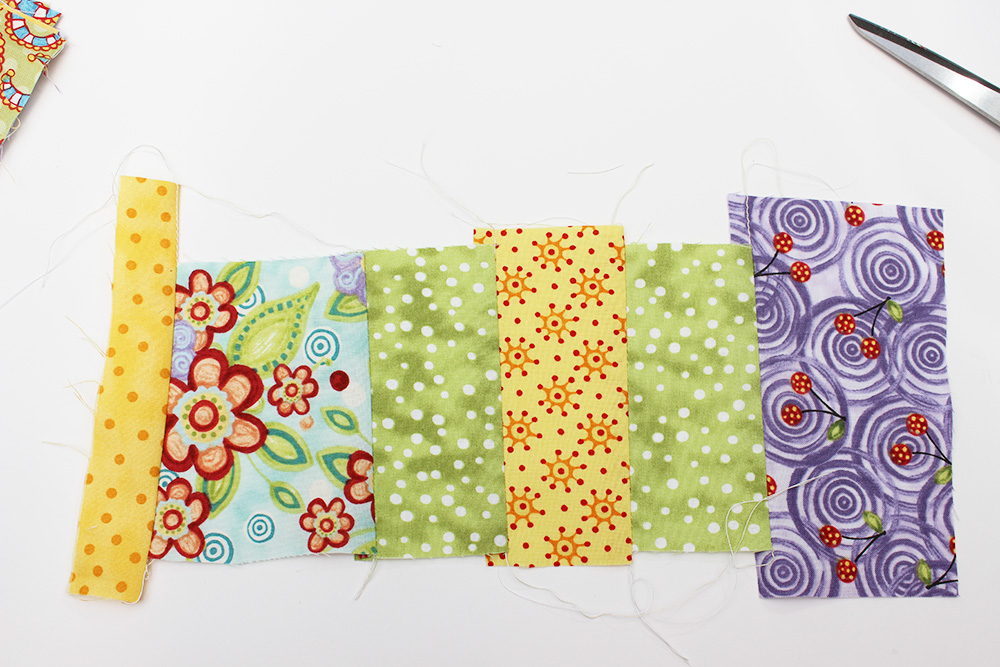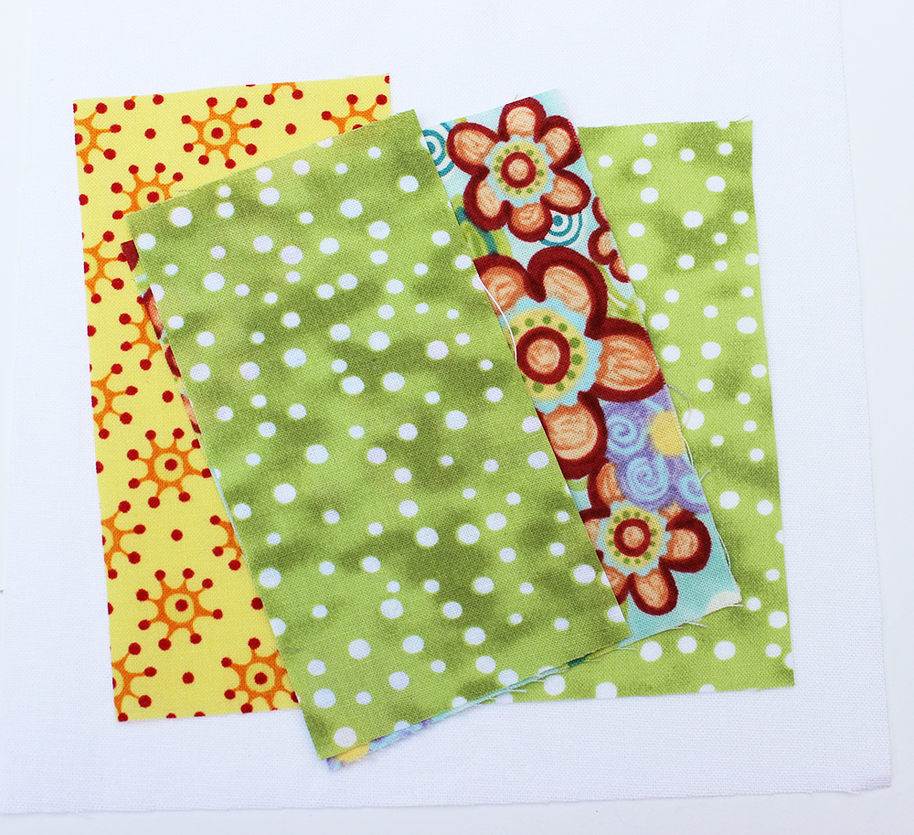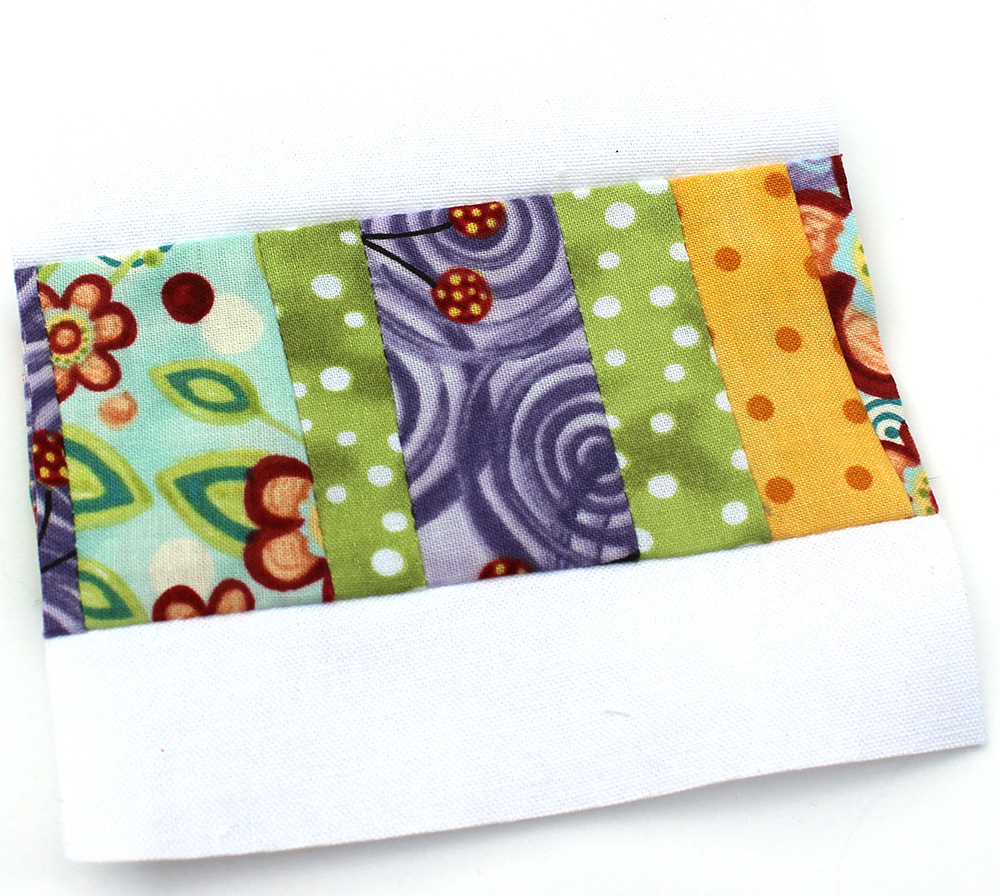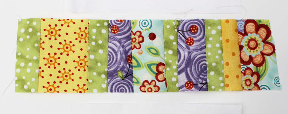 Start with some scraps that are roughly skinny rectangles. Sew them together side by side.