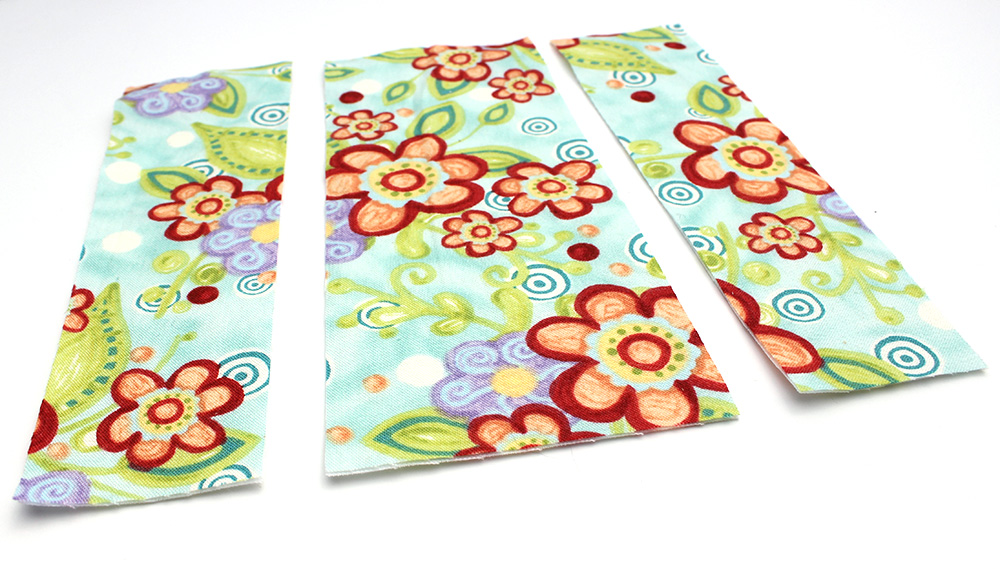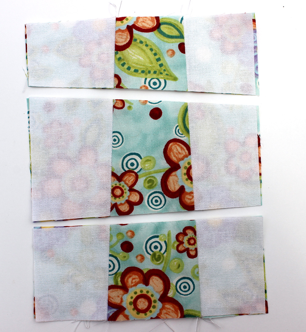 Sew the three pieces together and press the seams. Place the two blocks on top of each other making sure that both blocks are right sides facing up. Cut into 3 raows again.