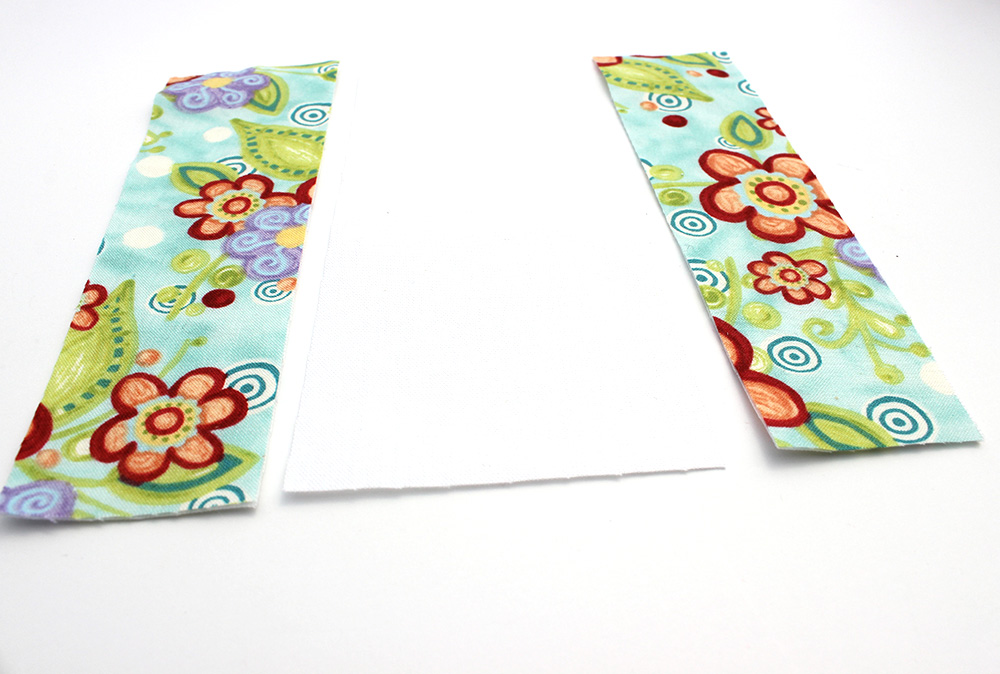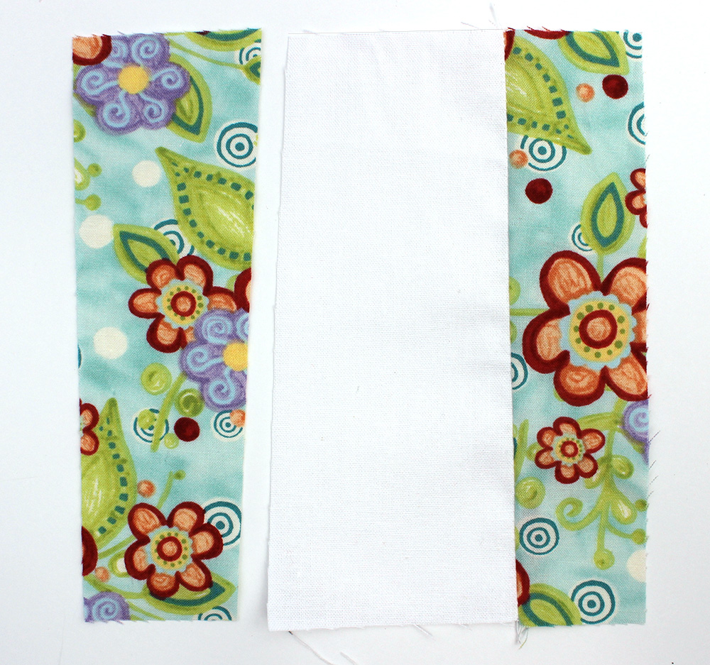Keeping the block the way you cut it will keep the pieces organized easier for you. Arrange two blocks on your work table so that each block has two matching outer strips and a different fabric in the center.