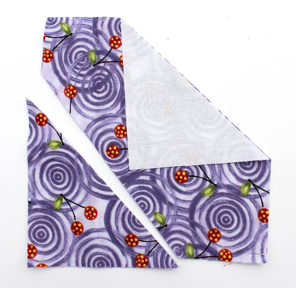 Sew the outside triangle of one fabric to the inside diagonal strip of another.