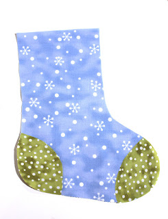 Fold a 2" piece of ribbon and tuck in at the top of the stocking fabric and pin. This is your hanging loop. Follow the stitch lines on the cuff pattern piece. Stitch by angling in away from the edge of the felt. By the time your ready to stitch the fabric part of the stocking, you should be using a 1/4" seam allowance to sew around.