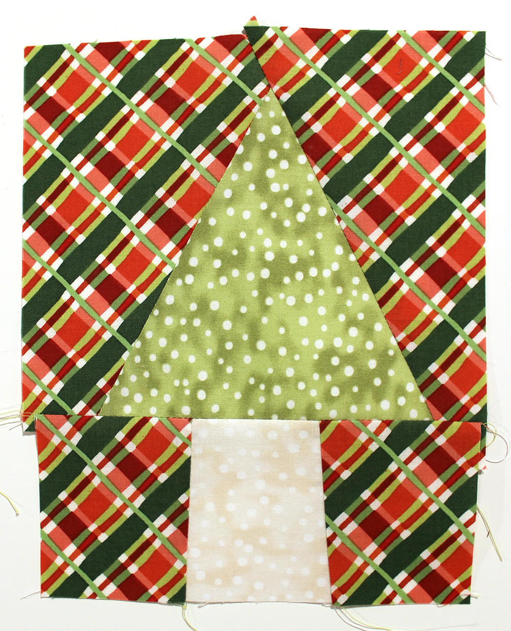 Angle the ruler and cut a diagonal in the top portion of the block. When you choose where to cut, keep the ruler at least a 1/4" in from the raw edge. This will keep your tree points in the sewn block. You can see I moved mine in even more to be safe.