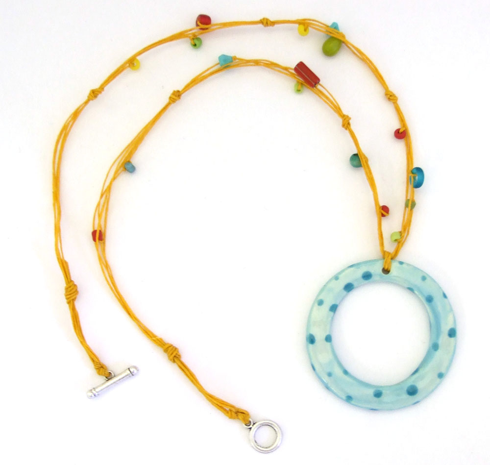 Here's a quick little project that doesn't take a lot of supplies, tools, or time. Here's what you need: 4 yards of waxed cotton, hemp, or twine, assortment of glass and wood beads, a toggle clasp, and a pendant.