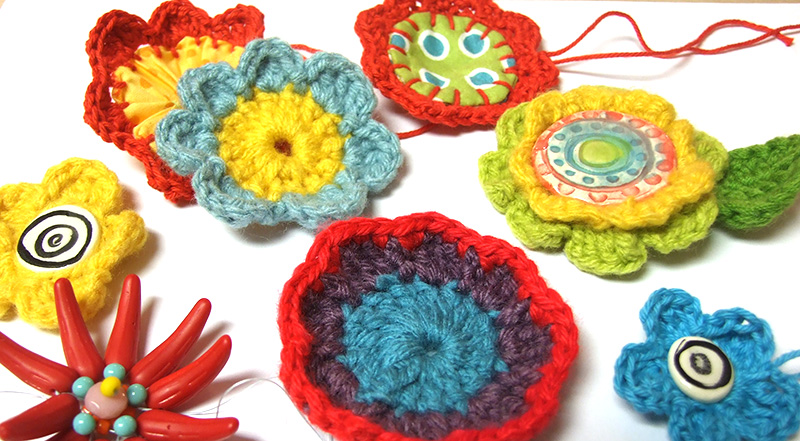 Thought I would show you what I have been playing around with lately. Flowers are always a theme running through my work so when I started crocheting it was one of the first things I attempted. Then, of course, my mind started running in a million different places about what could be done with crochet flowers.